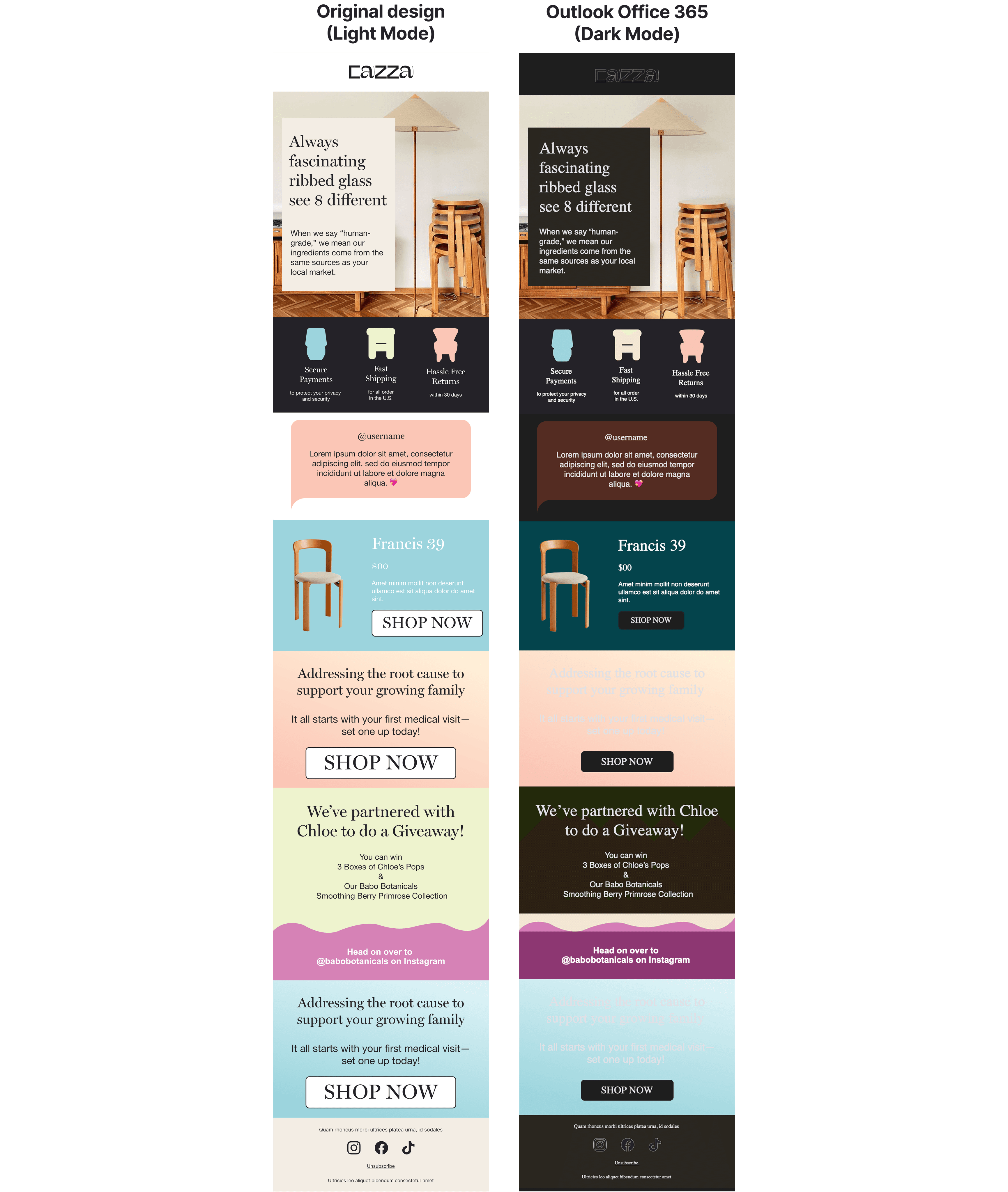 Layout tables use role="presentation" | Decorative images use | Information is not conveyed through color alone | Touch targets are a minimum of 44×44px | Tested in Outlook dark mode |